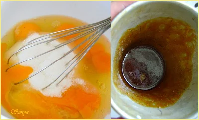 - 10 те лъжици захар с 1 с.л. вода се загряват в подходящ съд до получаване на светъл карамел